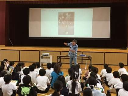 4時間目には、講師の阿部夏丸氏をお迎えし、「川の生き物」をテーマにお話を伺いました。阿部氏の豊富な知識と実体験に基づくお話に、子どもたち全員が引き込まれました。