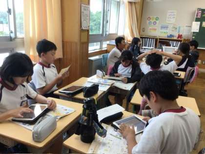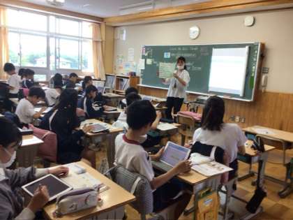 外国語の授業で、自分の一日の生活をグループで紹介し合っていました。簡単なメモカードを持ちながら。聞きやすい声で伝えていました。
