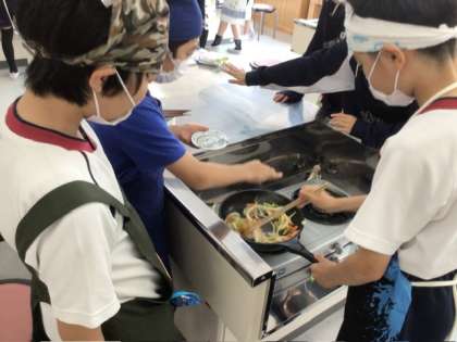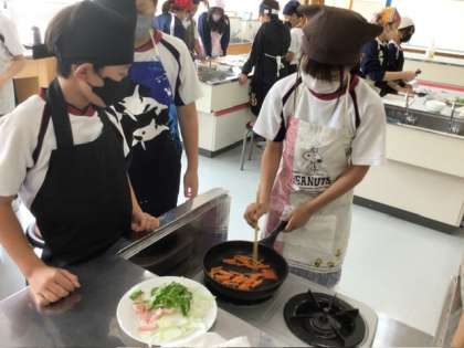 家庭科の授業で、班ごとに「いろどり炒め」を作る調理実習を行いました。野菜の切り方や炒める順序、火加減に気を配りながら、協力しておいしい1品が出来上がりました。