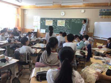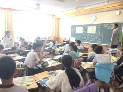 社会の授業で歴史の学習が始まりました。縄文時代と弥生時代の想像図を見比べながら話し合いを行い、自分たちで感じた疑問を学習課題として進めていきます。