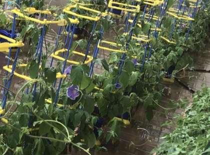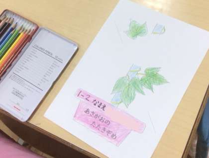 生活科の授業で育てているアサガオが、咲き始めました。雨天続きでじっくり観察することはできませんでしたが、咲いた花を使って「たたき染め」の準備を進めました。この作業を楽しみにしながら、葉っぱの色塗りをしていました。