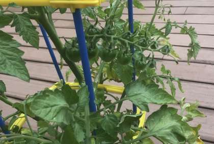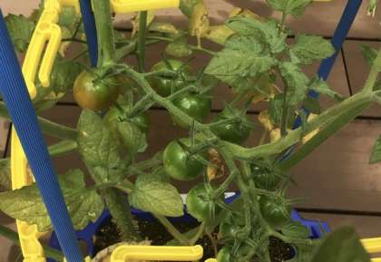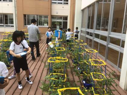 雨の合間をぬって、ミニトマトの観察を行いました。 たくさんの実がついており、色づき始めたものも見られました。収穫の時期が待ち遠しいですね。