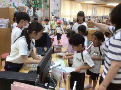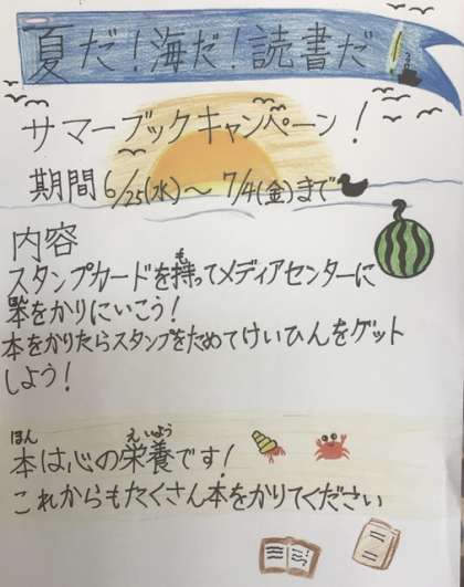 図書委員会が「サマーブックキャンペーン」を企画してくれました。休み時間にたくさんの子どもたちがメディアセンターを訪れ、楽しそうに本を借りていました。この活動を通じて、子どもたちがさらに読書を楽しむきっかけになればうれしいです。
