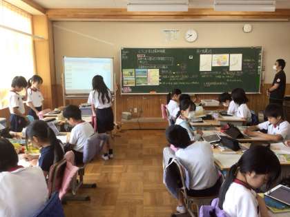 社会「くらしを支える食糧生産」の研究授業の様子です。写真やグラフから気づいたことをグループで話し合いながら、日本の米の産地の特徴について考えました。全体発表では、互いの気づきを共有することで理解を深める姿が印象的でした。