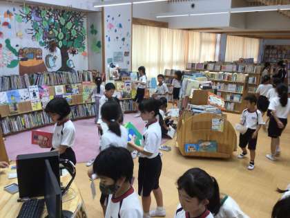 今日もたくさんの子どもたちがメディアセンターを訪れ、サマーブックキャンペーンを満喫していました。図書委員さんが温かく迎え入れる中、子どもたちは楽しそうに本を選んでいました。本を借りると、図書委員さんからスタンプをもらい、さらにうれしそうな笑顔が広がります。