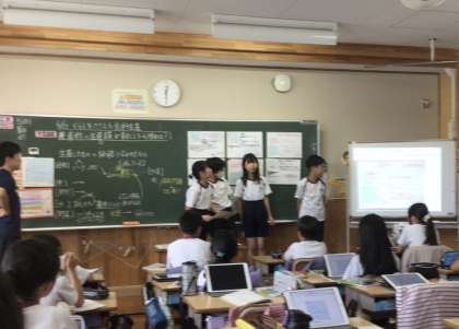 社会科「くらしを支える食糧生産」の研究授業が行われました。授業では、日本の農産物の生産額についてのグラフをもとに、その変化の理由を考えました。普段の生活やこれまでに学んだ知識を活かし、グループで意見を交換しながら積極的に話し合う姿が見られました。