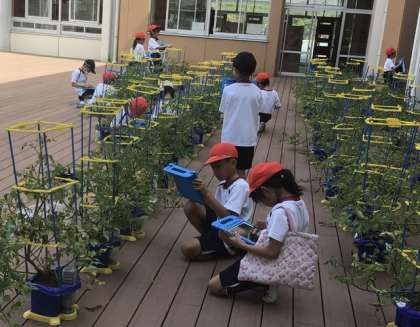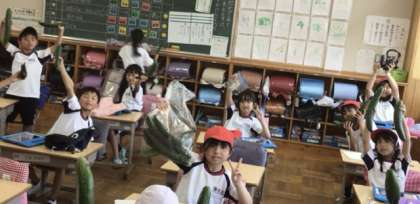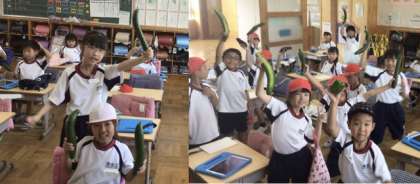 生活科で育てている夏野菜を観察していました。その後、教室に帰ると収穫した野菜を手に取り、子どもたちが喜びの表情で見せてくれました。