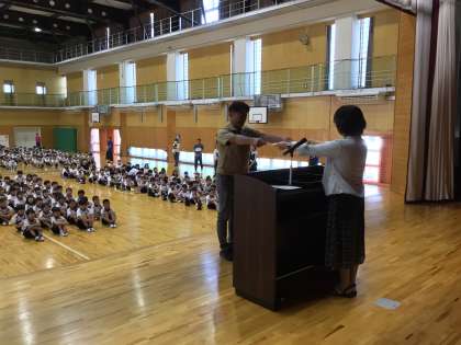 本日、全校集会にて浄水北小学校および里山づくりの会の活動が評価され、表彰されたことをお披露目する会を行いました。