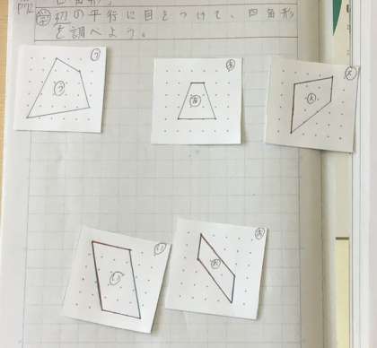 算数の授業で「四角形」の仲間分けに挑戦しました。子どもたちは、四角形の辺の位置関係に着目し、どの辺が平行であるかを考えながら分類を行いました。今日は、平行が何組あるのかに注目して進めることで、四角形の特徴や違いを学ぶことができました。
