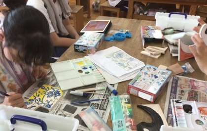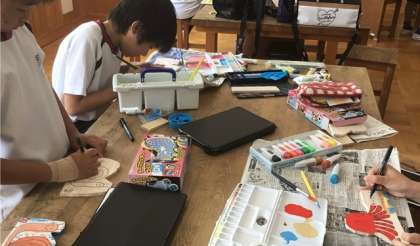 図画工作の授業では、オリジナルのテープカッター作りに取り組んでいます。まず、下絵を描き、それをもとに糸のこを使って形を切り出しました。さらに、絵の具を使った色付け作業に進み、完成に近づいています。
