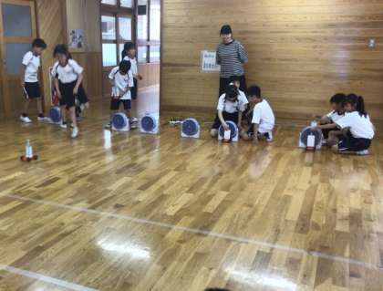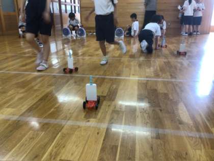 理科の授業で、風で動く車を制作しました。風の強さを変えたときの車の進む距離を比較しながら、風の力のはたらきを調べました。