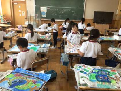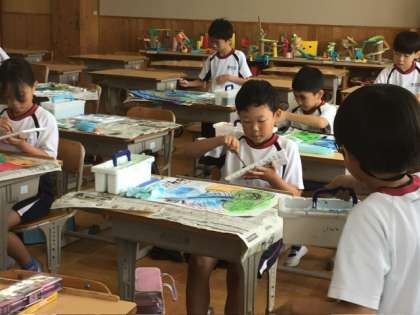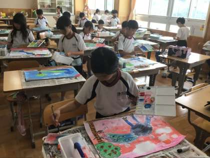 図画工作の授業では、物語の絵に色を塗る学習をしていました。子どもたちは、クレヨンだけでなく絵の具も使い、自分のイメージした色彩で自由に表現しました。