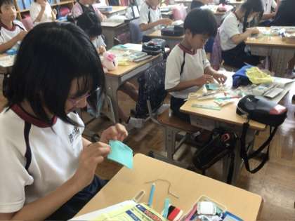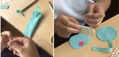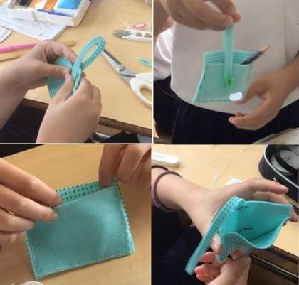 家庭科の手縫いの授業では、子どもたちがこれまで学んだ技術を活かして、フェルトの布を使ったミニバッグ制作に取り組んでいました。縫い方や形に工夫を凝らしながら、楽しそうに制作をしていました。