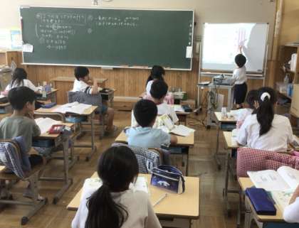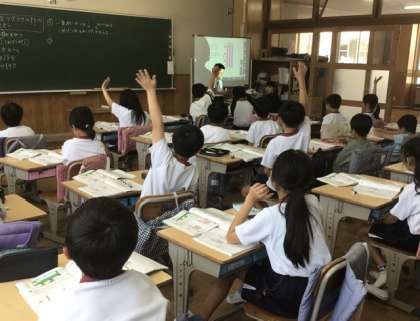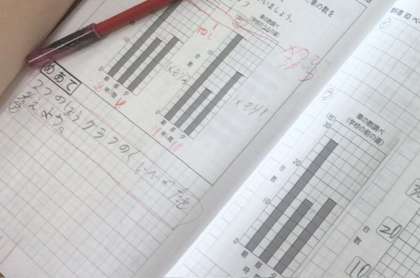 算数の授業で棒グラフの学習をしていました。目盛りのつけ方が違う2つのグラフを比較して、目的に合った目盛りのつけ方について考えていました。