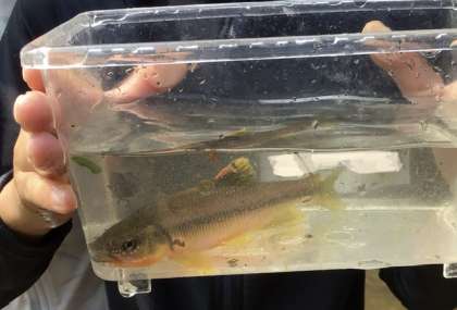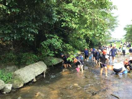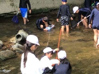 総合的な学習の時間に、伊保川へ行き、各自が興味を持った課題の追究に取り組みました。川の流れの速さを計測したり、源流や川の石について調べたりする中で、新たな発見がたくさんありました。中には魚に興味を持ち、大きなカワムツを捕まえることに成功した子もいました。