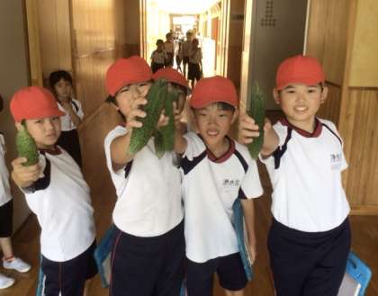 廊下を歩いていると、ツルレイシの観察を終えた4年生が教室に戻る姿を見かけました。「初収穫です」とうれしそうに成長したゴーヤを見せてくれる子どもたち。その表情から、植物の成長を見守る喜びが伝わってきました。