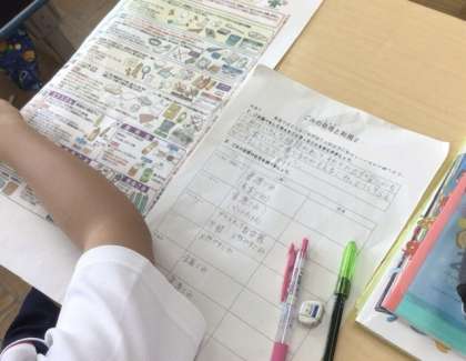 社会の授業では、豊田市のルールに沿ったごみの分別方法について調べていました。それぞれの物によって処理方法が異なることを知りました。この学びを、家庭での生活にも活かしていってほしいです。