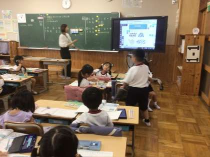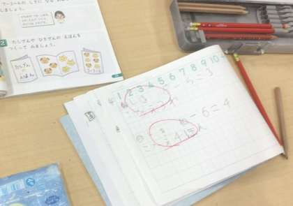 算数「ちがいはいくつ」の学習の様子です。数図ブロックを使って考えることで、「ちがい」を計算する時もひき算を使うことを学びました。