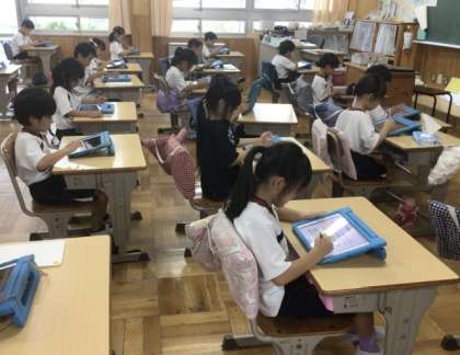 学習用タブレットの使い方を確認する時間を設け、子どもたちは黙々と各自の課題に取り組んでいました。夏休み期間中も、このタブレットを効果的に活用してほしいと思います。