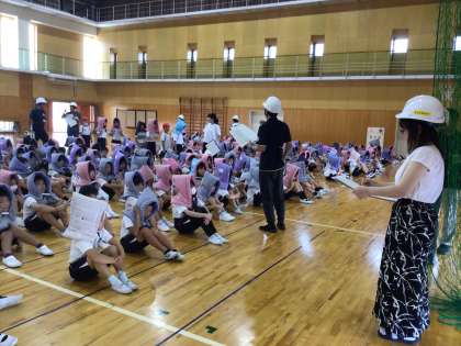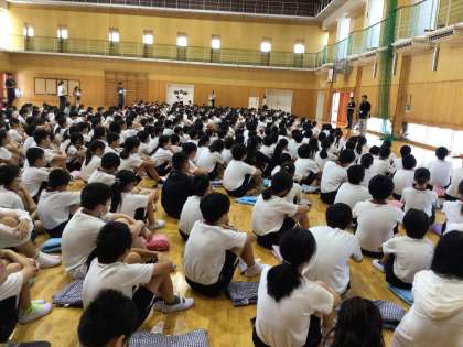 今日は厳しい暑さが予想されたため、避難場所を運動場から体育館へ変更しましたが、全校児童が落ち着いて静かに避難することができました。