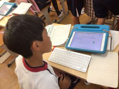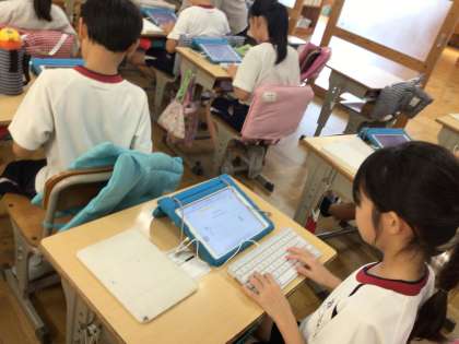 国語の授業では、ローマ字の学習の一環として、キーボード入力の練習を行っていました。