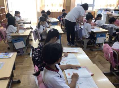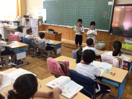 国語の時間に、友達の音読を一人ひとりが真剣な表情で耳を傾け、読み方を確かめながら学んでいました。