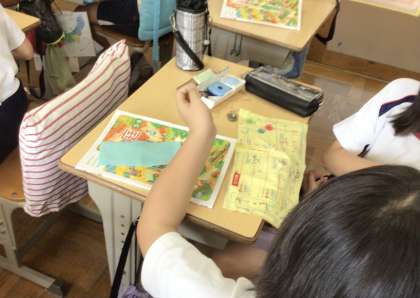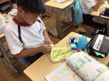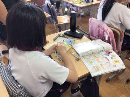 家庭科の時間に、手縫いでボタン付けやフェルト生地を使った小物づくりに取り組んでいました。はじめは針と糸に戸惑っていた子どもたちも、少しずつ手縫いの仕方に慣れ、集中して作業をしていました。