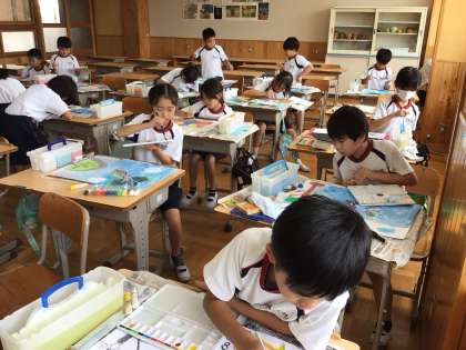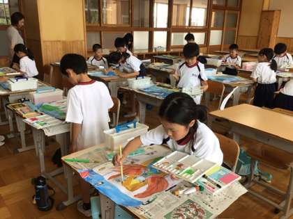 図画工作科の時間に、3年生が感想画の仕上げに取り組んでいました。絵の具やクレヨンなど、さまざまな画材を使って、思い思いの表現を楽しんでいる様子が見られました。