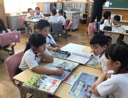 音楽科の授業では、「虫のこえ」の歌に登場するコオロギやクツワムシなどの虫の鳴き声について、グループで考えました。声の高さや大きさ、音の長さを工夫しながら、どんな鳴き方がその虫らしいかを話し合い、楽しそうに活動していました。