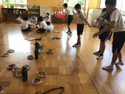 輪投げゲームの準備をしている様子です。明日の昼休みの時間に「ヒーローズ」として、6年生の有志の子どもたちが全校を楽しませる会を計画してくれています。毎回楽しみです。6年生の皆さん、よろしくお願いします。