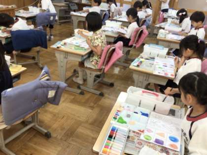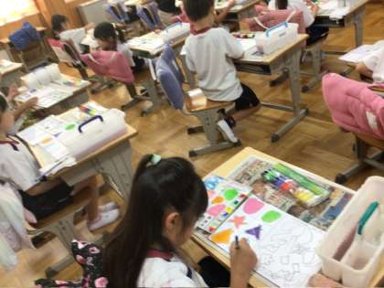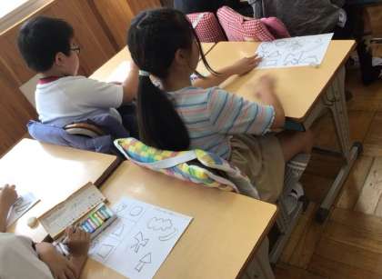 自分で描いた形に、2つの色を混ぜて塗ることで、色の変化や組み合わせの楽しさを感じながら活動していました。筆を丁寧に洗ったり、水をうまく混ぜて使ったりと、道具の使い方にも気をつけながら、集中して取り組んでいました。