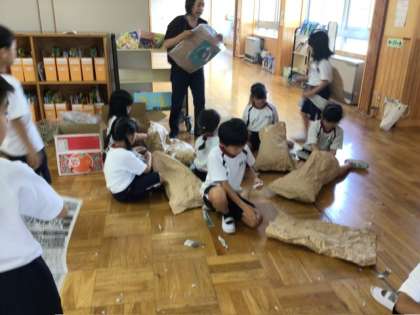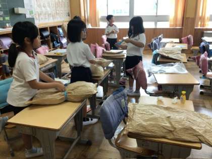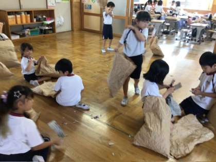 図画工作科では、「くしゃくしゃ ぎゅっ」の学習に取り組みました。くしゃくしゃにした大きな紙の中に新聞紙をつめて、紙の手触りや形の変化を楽しみながら活動していました。