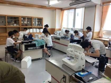 家庭科の授業では、トートバッグづくりに取り組んでいます。修学旅行で使うサブバッグとして、自分の手で仕上げることで、より愛着のある持ち物になります。友達と声をかけ合いながら、ミシンの使い方を確認し、丁寧に縫い進めていました。
