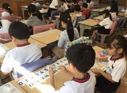 算数の授業では、「10より大きい数」について学習していました。子どもたちは、1から20の数字カードを使って数の順番を確かめたり、友達と協力して並べたりしながら、数の並びや関係について楽しそうに学んでいました。
