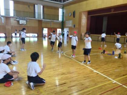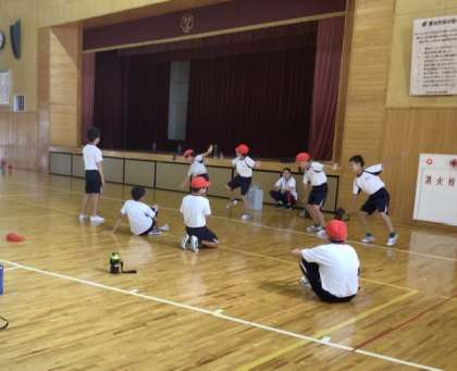 体育の授業では、「ソーラン節」の練習に取り組んでいました。グループごとに動きを確認し合いながら、互いに見合って工夫を重ねています。