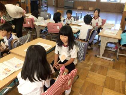 国語の研究授業の様子です。「かいがら」を読み、一番好きな貝がらをあげたくまの子の気もちを考えました。ペープサートを使ってくまの子になりきり、「どんな気もちだったかな」とみんなで想像しながら学ぶことができました。