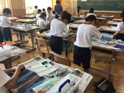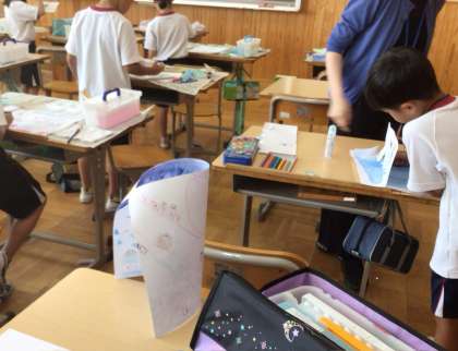 図画工作科の学習で「立ち上がった絵のせかい」に取り組みました。 立ち上がる紙の両面に絵をかいて、土台に立たせることで、立体的な作品づくりを楽しんでいました。 どんな世界が広がるのか、完成が楽しみです。