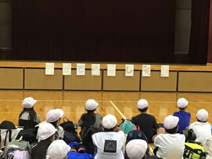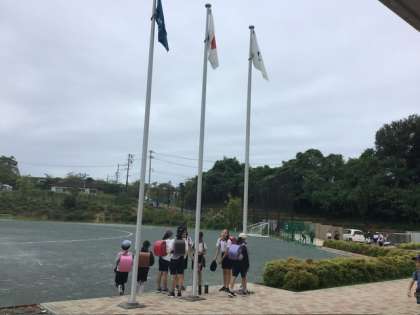 本日はいよいよキャンプの出発日。いつもは5年生が担当している国旗・校旗の掲揚を、今回は6年生が行ってくれました。体育館には「いってらっしゃい」のメッセージも掲げられ、朝から6年生の温かい気持ちが伝わってきました。