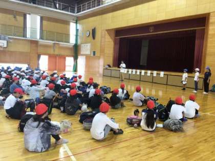 体育館で出発式が行われました。子どもたちは、笑顔で式に臨んでいました。「キャンプが楽しみ」という気持ちが、顔いっぱいにあふれていました。
