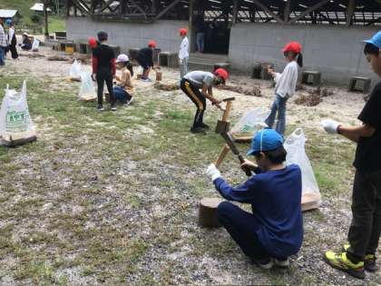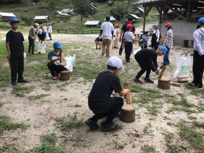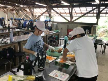 薪や食材の準備を、班ごとに分担して協力しながら進めています。いよいよ本格的な調理が始まります。