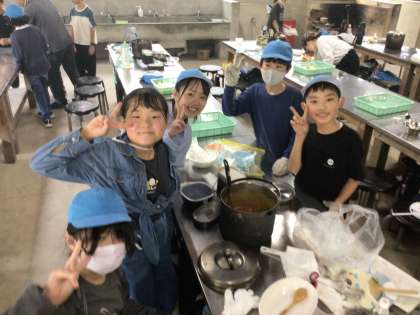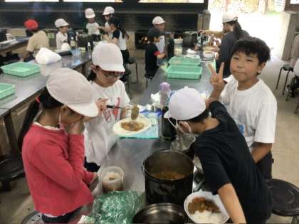 協力して作ったカレーは、味も格別です。笑顔いっぱいの食事時間になりました。