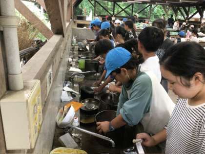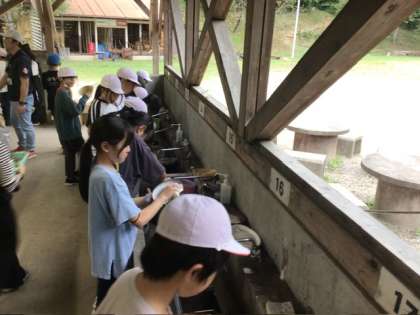 カレーをおいしくいただいた後は、鍋や飯盒、使った場所の片付けです。鍋はぴかぴかになるまで磨き、所員さんのチェックを受けます。