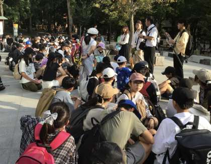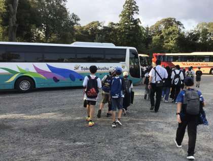 班ごとに見学した後、子どもたちは時間通りに集合することができました。これからバスに乗って、宿泊先の旅館へ向かいます。