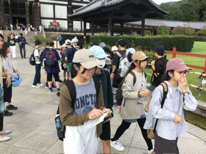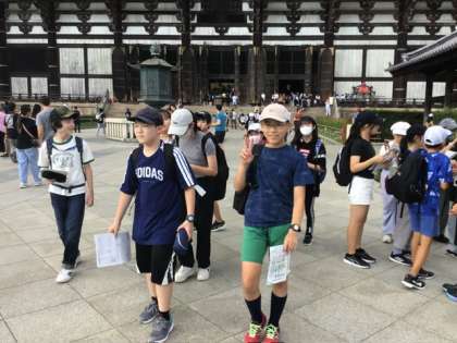 東大寺の大仏殿の見学を終え、子どもたちは班ごとに分かれて奈良公園の見学に出かけました。それぞれの班が事前に計画したルートをもとに、地図を確認しながら協力して行動しました。