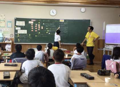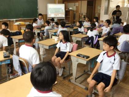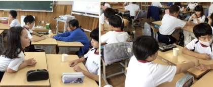 算数の研究授業で「あまりのあるわり算」について学習しました。先生が「14÷4=2あまり6」と解答を提示すると「おかしい」「ちがうよ」と、すぐに子どもたちから声が上がりました。その後、わる数とあまりの関係について、おはじきを使って実際に確かめながら、みんなで考えていました。