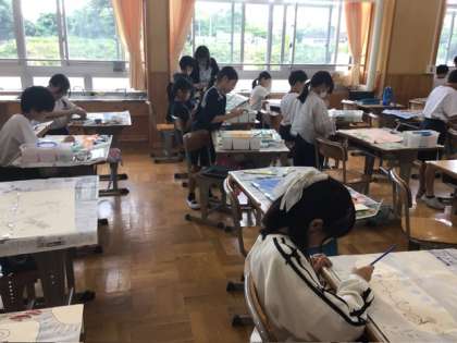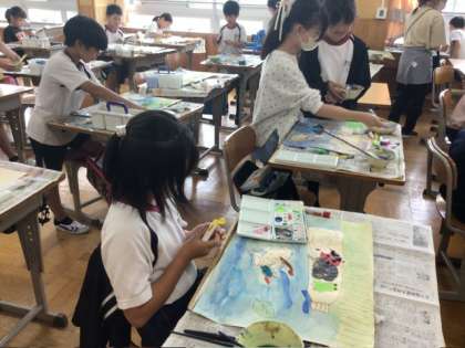 図画工作の授業では、『あまがえるりょこうしゃ』の本を読んで、心に残った言葉から感じたことや想像したことを絵に表しました。子どもたちは、それぞれが思い描いた場面の様子を楽しそうに描いていました。