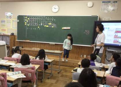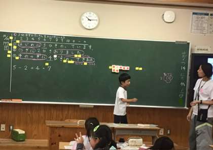 算数の授業では、「3つのかずのけいさん」の学習を行いました。お話の流れに合わせて、おはじきを出したり取ったりしながら、計算式のイメージをつかんでいきました。