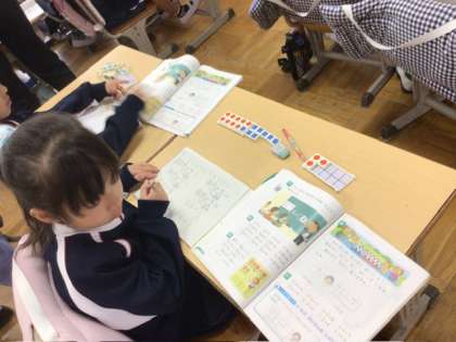 算数の授業では、「9+〇」のような繰り上がりのあるたし算の学習をしました。数図ブロックを使って、9に1をたして10のかたまりをつくることで、計算がしやすくなることを学んでいました。