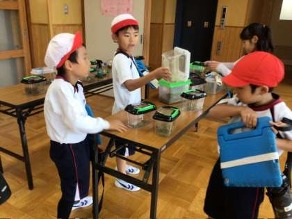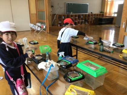 生活科の授業では、中庭や校庭で見つけた身近な生き物の観察を行っています。子どもたちは、生き物を採集した場所の環境を思い出しながら、それぞれの生き物が安心して暮らせるすみかづくりに取り組んでいます。