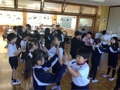 運動会に向けて、練習が始まりました。学級で並ぶ位置を確認したあと、ワークスペースでダンスの練習に取り組んでいました。